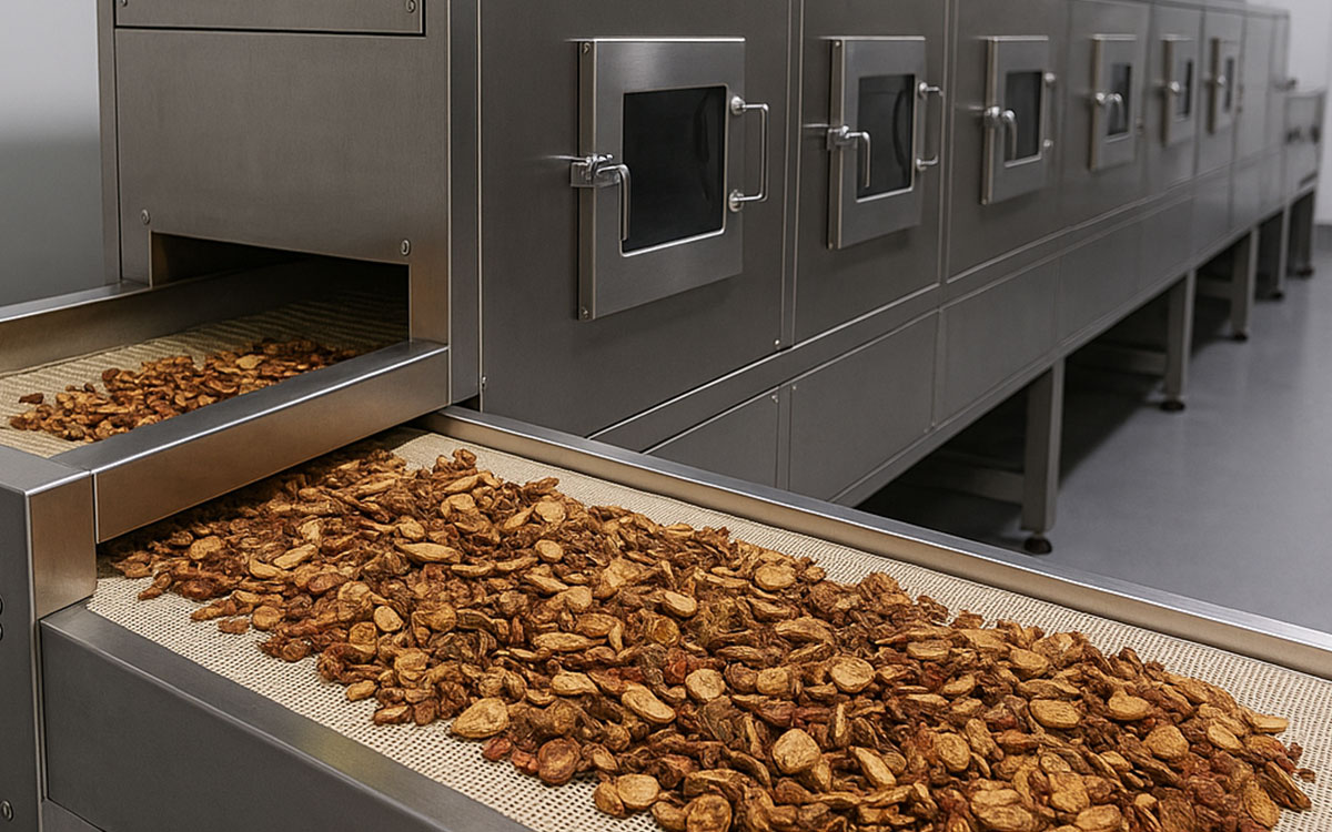 Microwave drying and pest control for dried foods and herbal teas, dehydration and sterilization of vegetables, preheating for garlic and onion peeling, low-temperature drying of herbs and spices, and rapid drying of grains and seeds. Microwave technology is widely applicable in both primary and deep processing stages.